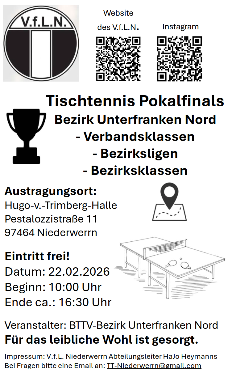 Trainingszeiten der Tischtennisabteilung des VfL Niederwerrn:
